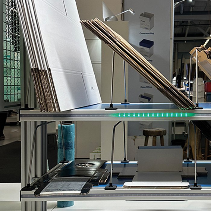 Die Fotogalerie bietet einen Einblick in die Details des Vorzeige-Packarbeitsplatz an der EMPACK Messe 2026.Gezeigt werden verschiedene Verpackungsmaterialien und ihr jeweilig spezifische Entnahme- bzw. Weiterverarbeitungsstation. Die Aufnahmen zeigen, wie anpassungsfähig die modularen Systeme sind: Sie lassen sich auf Prozesse, Umgebungen und ergonomische Anforderungen abstimmen und unterstützen so ein effizientes und gesundheitsförderndes Arbeiten.