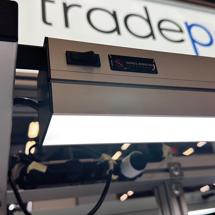 Die Geräte und Materialien wurden perfekt in eine für die Messe eigens von FMS-Technik konstruierte Arbeitsplatzinsel integriert. Das System besteht aus mehreren Tischen, Aufbauten, Gerätehalterungen, Materialablagen, Beleuchtung, Elektroinstallationen und Beistellwagen.